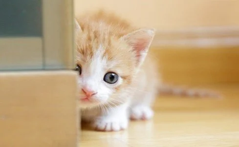Timid, fearful looking kitten hiding and not wanting to interact.